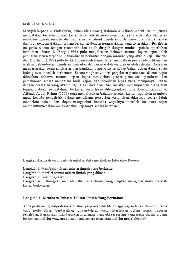 Kajian Tindakan Sorotan Literatur Pdf Contoh abdullahmohamadsaid 1999 yang memetikmaksuddalamkamuswebstermenjelaskantentang. SOROTAN PENULISAN Literature Review PERSAMPELAN PENGENALAN Tujuan utama penyelidikan ialah bagi menemui sesuatu prinsip dan boleh diaplikasikan secara universal. Berikut urutan cara membuat studi literatur yang baik dan benar supaya dapat menjadi rujukan yang terpercaya.